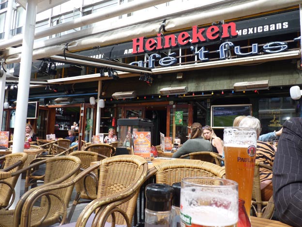 Heineken finns överallt i Holland, även i Rotterdam. När vi hade besökt en stor utomhusmarknad med fisk, kött, grönsaker, kläder, väskor och allt man kan tänka sig, hamnade vi på en uteservering nära rådhuset.