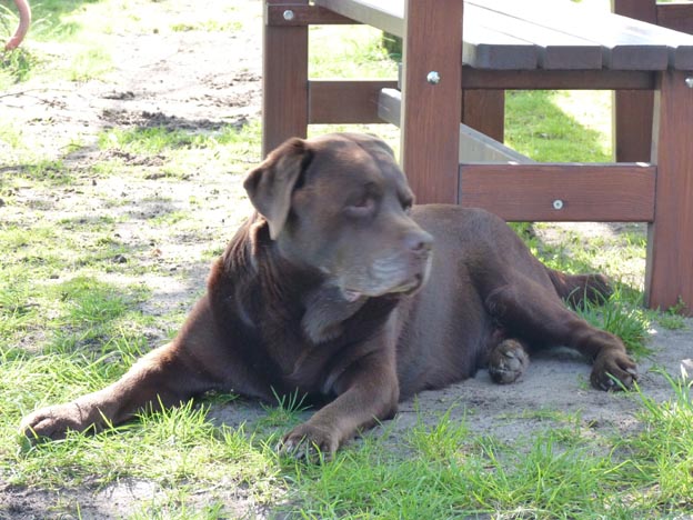 På campingen arbetar den här hunden. Han brukar ha en väst på sig med texten ”Platzwart”, platsvakt ungefär. Han har strosat omkring på campingen och kollat läget i många år, men just idag var han ledig. Han börjar bli gammal och behövde vila. Det har hänt att han har talat om för campare att de inte har spänt säkerhetslinorna till sin markis ordentligt när det har blåst. Han markerar även skräp som blåser iväg.