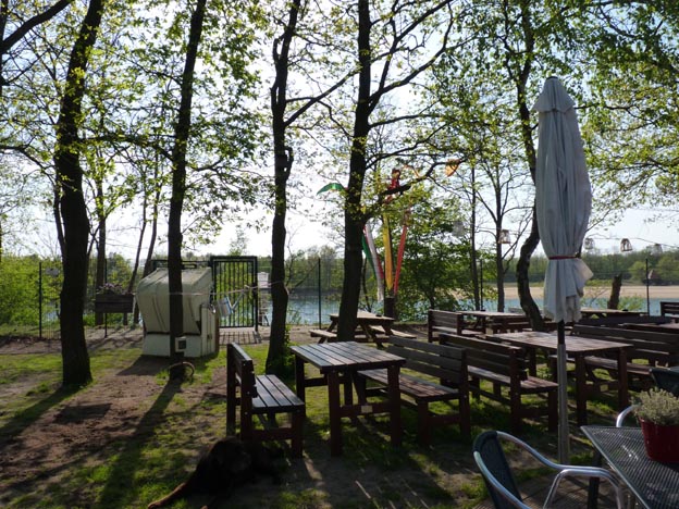 Det finns några bord inomhus också, men det var fortfarande perfekt väder, så vi gick in talade om att vi ville ha mat, och att vi ville sitta ute. Det tog inte lång tid innan ägaren kom springande med menyer och frågade om vi ville ha varsin öl. På den här campingen har de väldigt god schnitzel, med en ännu godare sås gjord på grädde och champinjoner. Den schnitzeln är ett måste när man är där.
