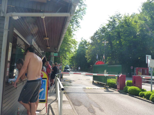 Damen i lucka 2 visade vart vi skulle åka på en karta, som vi fick memorera. Plats nummer 105. Den sista stora platsen på hela campingen. Vi fick också köpa ett kort till grinden för 25 €, de pengarna fick man tillbaka när man checkade ut.