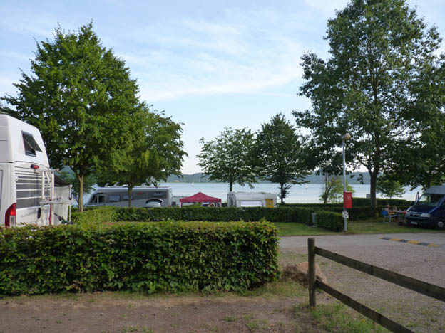 Vi stod på gatan längst från sjön, men tack vare att platserna var i små etapper, och att man stod lite omlott jämfört med platsen nedanför, såg vi sjön från vår plats. Campingen är väldigt lång, men inte så bred.