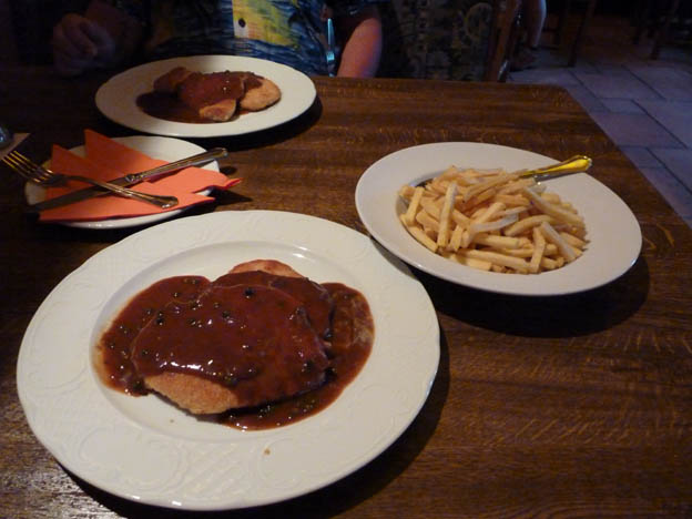 Vi beställde varsin pepparschnitzel. Det visade sig vara två stora köttbitar var, och massor av pommes. Det var väldigt gott och väldigt bra service. 44 € för 2 schnitzlar och 2 stora öl.
