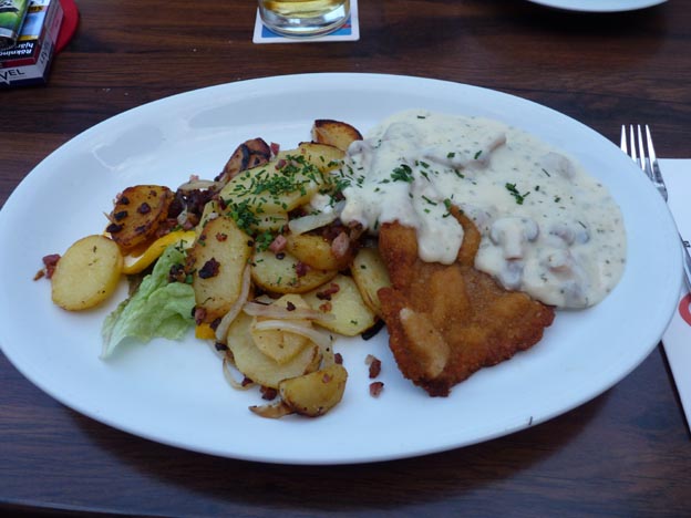Vi fick plats på en av uteserveringarna, restaurang Mendoza, på en tvärgata en liten bit bort från vattnet. Lelle beställde rumpstek och jag åt schnitzel, i vanlig ordning. Jag brukar prova schnitzel på restaurangerna runt om i Tyskland. Den här schnitzeln var en av de bättre. Svampsåsen som serverades till var mycket bra.