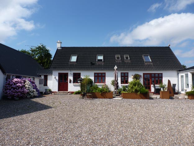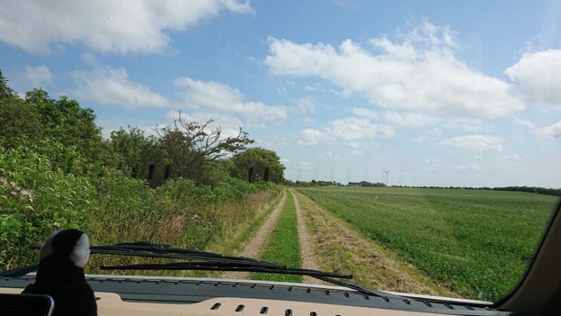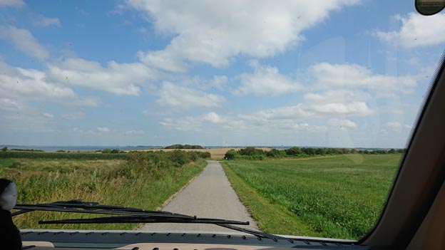 Precis som mannen i telefonen hade sagt, så såg vi Pintrip-skylten på en gång när vi kom in på gårdsplanen. Limfjorden såg vi också, men väldigt långt bort.