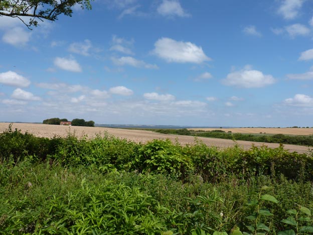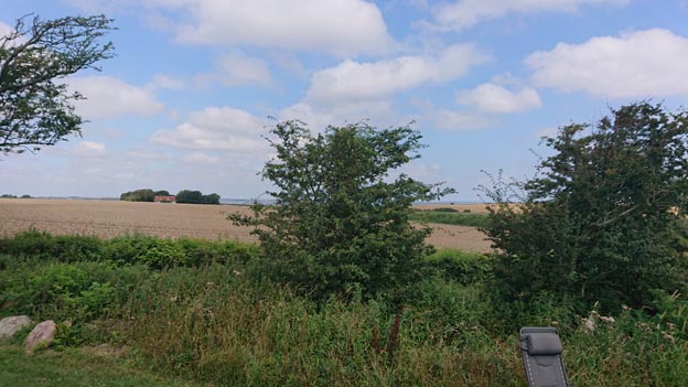 Limfjorden långt bort, åkrar och ett par bondgårdar. En typisk bild av dansk landsbygd.