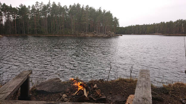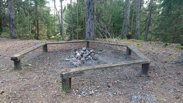 På flera platser finns eldstäder och bänkar. Ved tar man med sig själv, eller så plockar man pinnar i skogen.