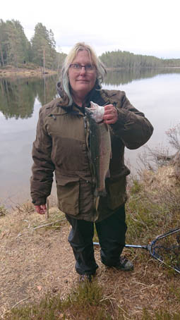 Där satt den, en regnbåge på dryga kilot. Vi fick två regnbågar i liknande storlek på hela dagen. En var, som tur var, så att vi slapp bli avundsjuka på varandra. Jag drog i och för sig upp fisken på Lelles spö också, eftersom han var och letade efter torra pinnar i skogen just när det nappade. Det var kallt som 17 så jag var glad att jag hade min vinterjacka med i bilen.