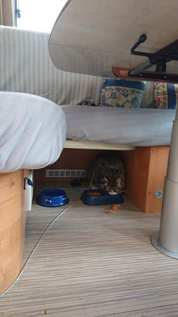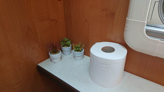 Vi duschar sällan i husbilen på helgerna. Skulle vi behöva duscha så har vi en bärbar utedusch. Duschrummet har helt enkelt fått bli plats för kattlåda. Där är det enkelt att sopa upp sand som hamnar på golvet, och det är enkelt att spola av väggarna om det dammar. För att hålla dörren öppen när vi står stilla använder vi en poolleksak som vi har skurit skåror i. Då slipper vi göra åverkan på bilen för att fästa en hasp eller liknande.