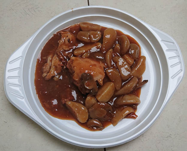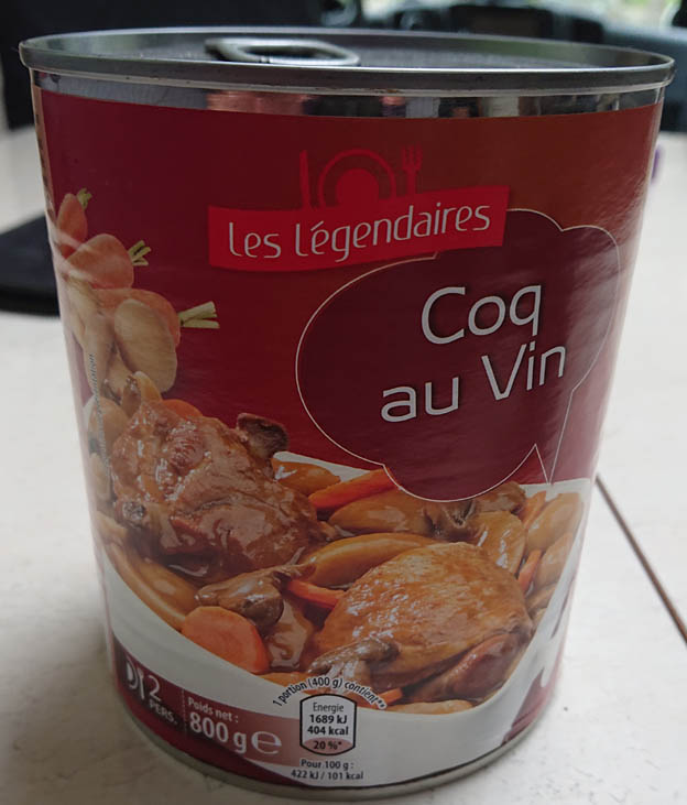 Vi hamnade vid en mindre tjärn i Krampenområdet som heter Gettjärn. Vädret var ostadigt och jag var hungrig, jag hade inte ätit så mycket på jobbet, så vi började med att gå igenom skafferiet. Vi handlade inget innan vi åkte, så vi fick ta det som fanns i bilen. Den här konserven hittade vi i Frankrike förra året, och den lät spännande. Den är inget jag rekommenderar. Det var 2 små kycklingbitar och en massa smaklös potatis och sås.