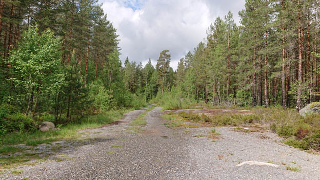 Från planen går det en gammal halvt igenvuxen väg ner mot sjön. Vi tror att den bara har använts för att köra ut timmer på.