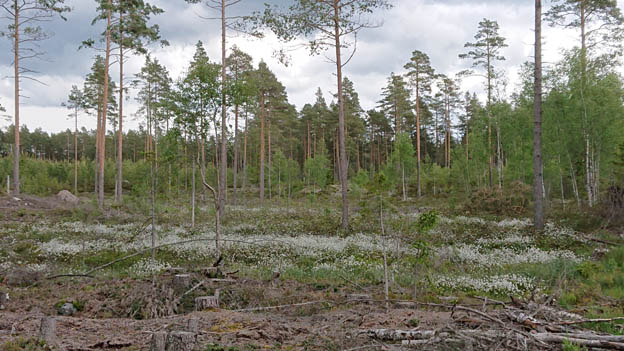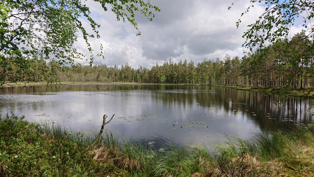 Runt tjärnen är det omväxlande kalhyggen, snårig skog och tallskog.