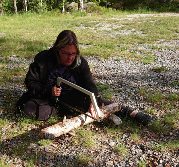 Det finns en bra eldstad, som någon hade försökt elda hela stockar i. Det var torrt i marken, men vindstilla, så vi bestämde oss för att göra en pytteliten mysbrasa på kvällen. Vatten hade vi ju precis bredvid. Den här ihopfällbara sågen, köpt på loppis, visade sig vara väldigt smidig. Den kan jag verkligen rekommendera.