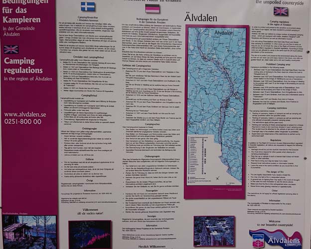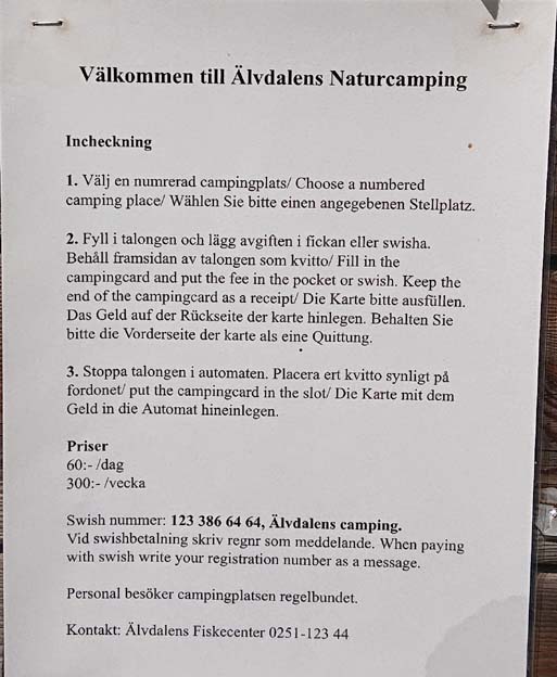 På informationstavlan fanns info på olika språk om vad som gällde på lägerplatserna. Mycket bra.