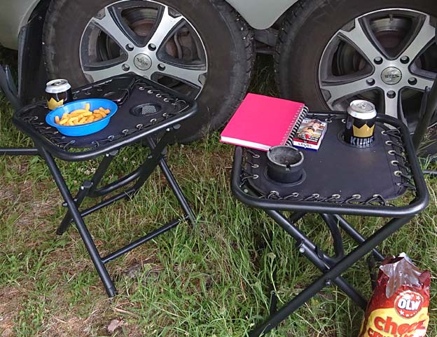 Enkla och smidiga bord, med ölhållare och allt. 99 kr/st. Perfekt på trånga ställplatser eller om man bara vill ha ett bord en liten stund.