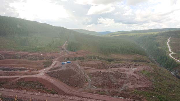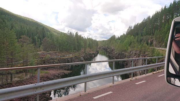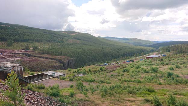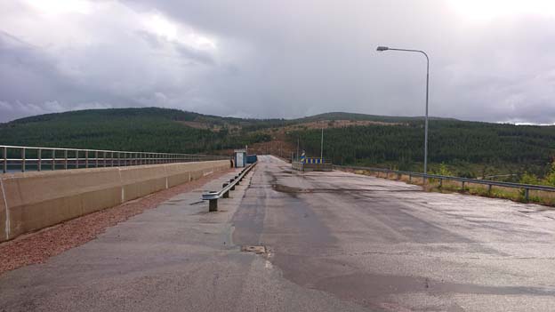 Vy från vägen över kraftstationen. På ena sidan vägen ser man sjön, på andra sidan ser man det här. Vattnet går genom turbinerna och leds i en underjordisk sprängd tunnel på 4,5 km. Den gamla älvfåran är helt torrlagd.