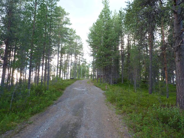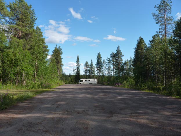 Vi ville fricampa någonstans mellan Pajala och Kiruna, men det visade sig att det var svårt att hitta platser som vi såg längs vägen. De grusvägar vi såg hade antingen brevlådor eller soptunnor bredvid sig, och då bor det ju antagligen människor i slutet av vägen. Där vill man inte stå. Många vägar hade bommar.