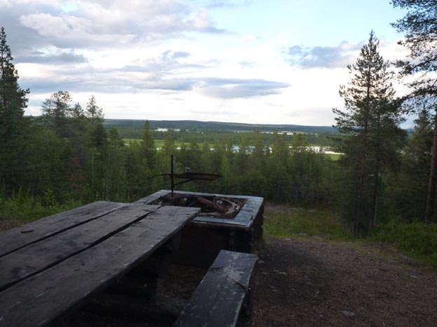 Från stugan hade man utsikt över myrar, sjöar, berg och skog. Det såg ut att finnas bra fiskevatten där. Där fanns också en grillplats. Ved fanns inte, det får man nog ta med sig själv.