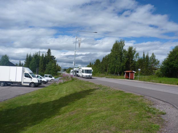 Det första vi upptäckte var att om man kommer ca 10 – 10.30 på förmiddagen, är det svårt att parkera 9 meter husbil. Vi fick inte plats på parkeringen helt enkelt, för det var redan en hel del bilar där. Där lastbilen på bilden står var det parkeringsförbud om man inte hörde till ishotellet. Vårt alternativ var bussparkeringen längs vägen, och så hoppades vi på att inte få böter. Det blev inga böter den här gången, och när vi kom ut hade fler husbilar följt vårt exempel.