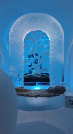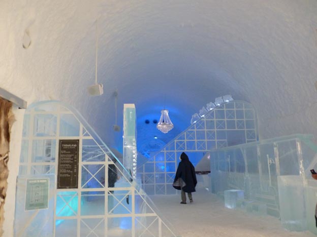 Biljetter för att se insidan av hotellet köper man i receptionen. För oss två vuxna kostade det 498 kr. Vi fick låna varsin poncho att ha på oss. Innertemperaturen i ishotellet är minus 5 grader. Med anledning av Covid 19 hade de utökat antalet visningar, och släppte in färre människor på varje visning. Vi behövde bara vänta ca 15 minuter.