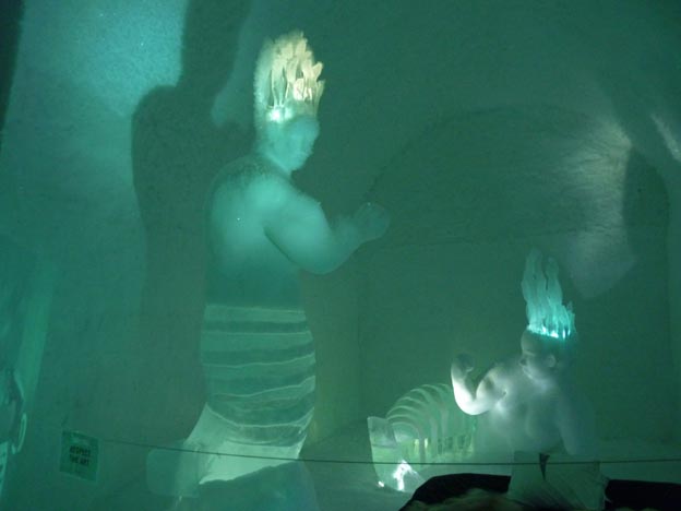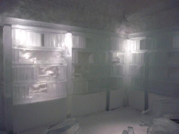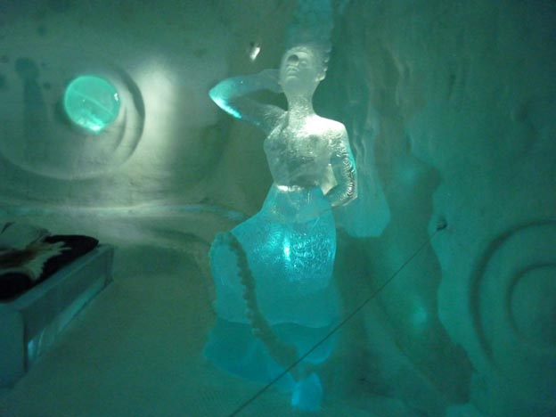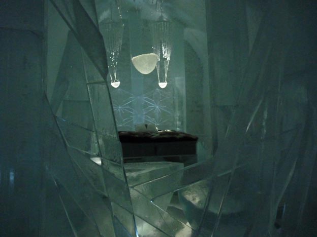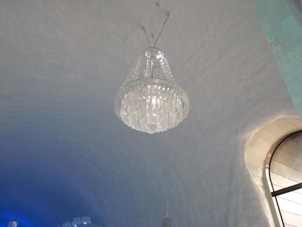 Även kristallkronorna i taket är gjorda av is.