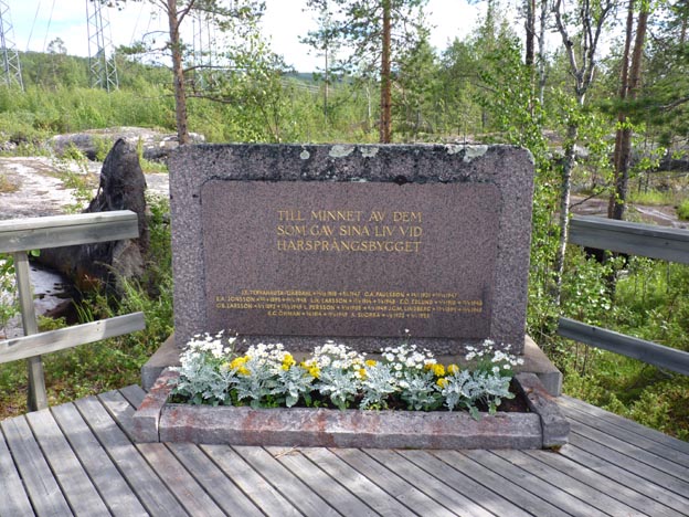 Längs gångvägen passerar man denna minnessten, rest till minne av dem som dog när dammen byggdes. Beslut om att bygga dammen togs 1918. Man började bygga samma år, men byggandet lades ner 1922 pga lågkonjunktur efter 1:a världskriget. 1945 började man bygga igen.