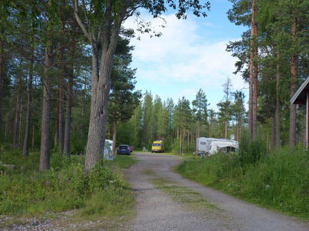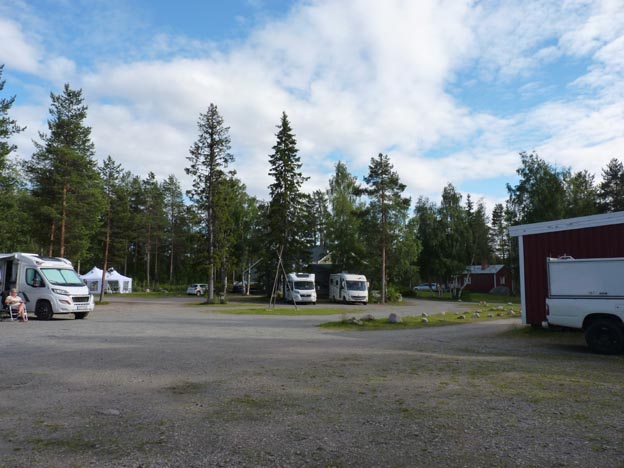 Campingen har två och en halv sektion, kan man säga. Det finns en grusplan, som vi fick ena änden av, och så stod de andra runt en liten rund gräsmatta.