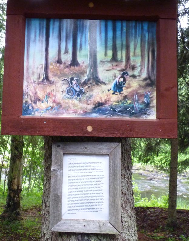 I skogen hittade vi inga fler figurer, däremot satt det tavlor på träden med kortare sagor och berättelser om olika väsen från folktron, bland annat om vittran. Vitterfolket kunde ställa till med mycket ofog och problem om de inte var nöjda med det du gjorde, så det gällde att passa sig för dem.