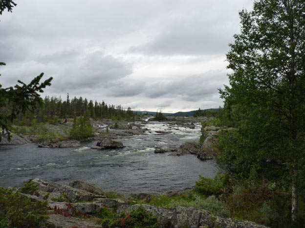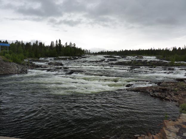 Längs Vildmarksvägen finns många forsar. Många är utmärkta med skyltar längs vägen, och de har mer eller mindre stora parkeringar. På bilderna ovanför och nedanför ser du Litsjöforsen. Där fanns en stor parkering med plats för många, både husbilar, husvagnar och personbilar. Forsen ligger lättillgängligt precis vid vägen.
