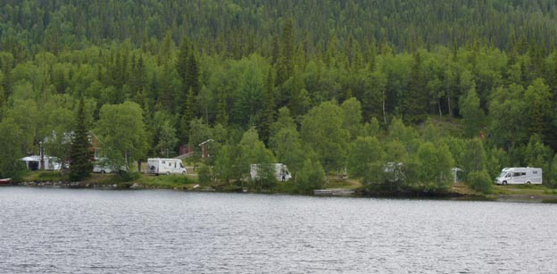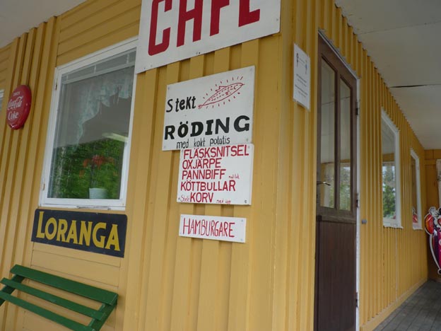 Sedan tittade vi på ett gult hus bredvid, där det fanns café och mat, och där det fanns en skylt om naturcamping. Vi tänkte inte mycket mer på det, inte förrän vi gick över bron över älven till själva kyrkstaden. Från kyrkstaden såg vi nämligen naturcampingen på andra sidan sjön. Den såg betydligt trevligare ut, och låg bakom det gula huset med café. Den kostade också 100 kr/dygn, som betalades i caféet. Nu hade vi ju redan betalat ställplatsen, så det var inte så mycket att göra åt den saken, annat än att konstatera att nu vet vi tills nästa gång.