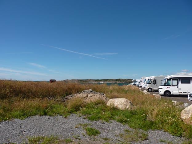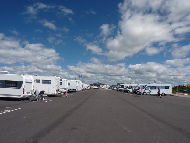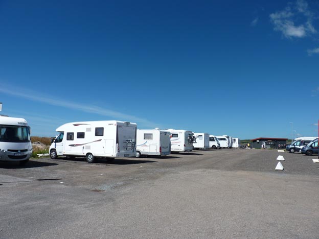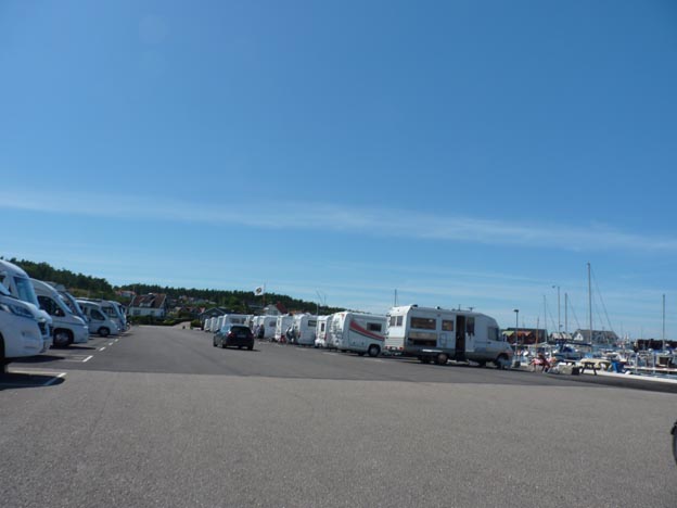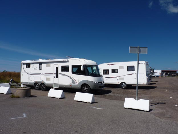 Vi åkte in längs raderna med husbilar och konstaterade att det redan var fullt, fastän vi kom före kl 12.00. Längst in gick det att vända, så det gjorde vi. Platserna är numrerade och väl uppmärkta med rutor på asfalten. Husvagnar är tillåtna, men personbilen får parkeras en bit bort.