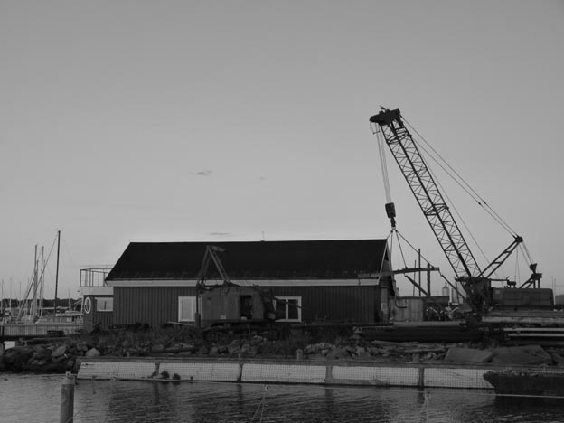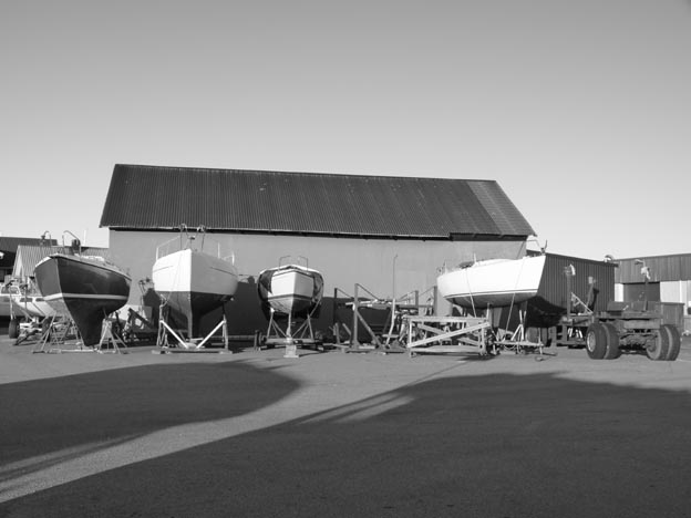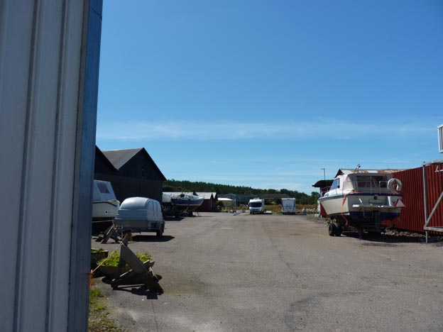 Bakom de här sjöbodarna låg den andra reservställplatsen. Vi var där och tittade, och där stod man också på grus, fast med baksidan av bodarna som utsikt.