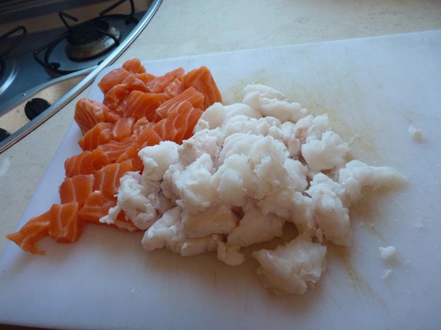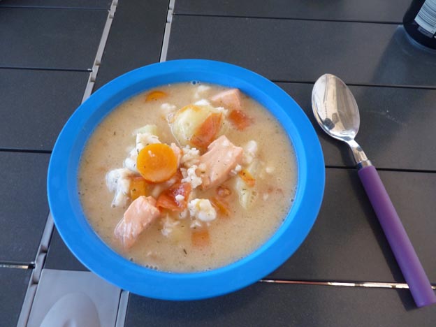Det blev en fisksoppa med lax, kummel, morötter, potatis, tomat, vitlök, vatten, grönsaksbuljong, salt, fiskkrydda, vitt vin och en redning på mjölk och vin. Det var vad vi hade att använda i bilen. Vi måste köpa fiskbuljong och mer grönsaker till nästa gång, och kanske lite grädde, men det blev bra ändå.
