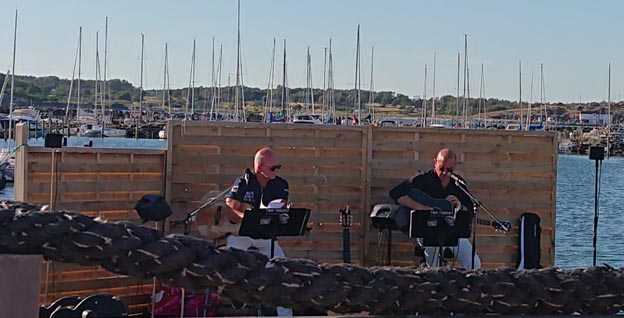 Mellan hamnen och ställplatsen finns en lång träbrygga. Det blev mer och mer folk på den under dagen. På kvällen hamnade det även bord och stolar där,