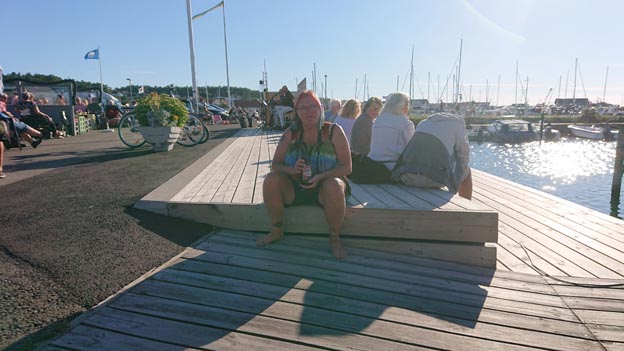 På kvällen gick vi bort till den lilla serveringen och tittade. Där var det massor av folk. Vi ställde oss i kö väldigt länge, ca 45 minuter, fastän kön före oss var kort. Bakom oss växte den. Vi köpte varsin flaska öl för 79 kr styck. 3,5 %. Det var det enda med alkohol som de hade. Övriga gäster hade med sig egen dryck. Jag ville ha en bild på mig i solen, i en hamn, med en pilsner i handen, så vi fixade det och sedan satte vi oss lite längre bort.