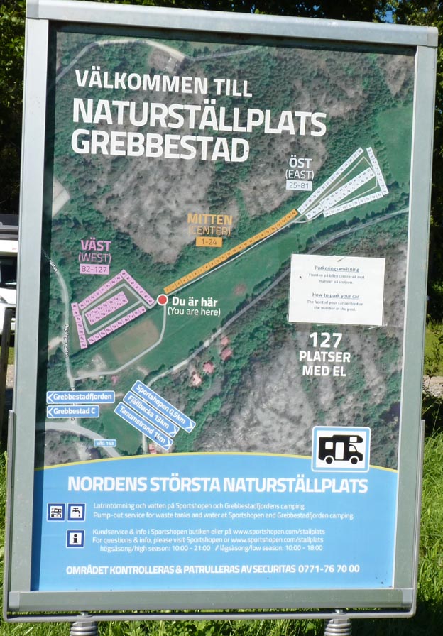 Platsen är uppdelad i tre sektioner: väst, mitten och öst. På väst var det en hel del ekipage när vi kom, men det fanns fortfarande tomma platser. Om de var lediga vet jag inte. Väst verkade vara mest populärt, kanske för att det låg närmast centrum. Från väst var det ca 500 meter att gå in till Grebbestad.