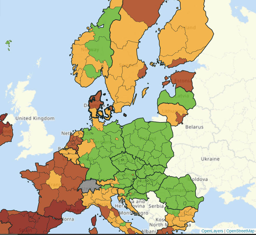 Som jag har skrivit tidigare, följde vi covidsituationen under hela resan, mycket med hjälp av appen Reopen EU, som är en gemensam app inom EU, där det bland annat finns en karta över situationen i Europas länder, och information om vad som gäller vid inresa. Kartan uppdaterades varje dag, ibland flera gånger. Här nedanför ser du en bild av hur läget är idag, 2021-08-18, när jag skriver det här inlägget.
