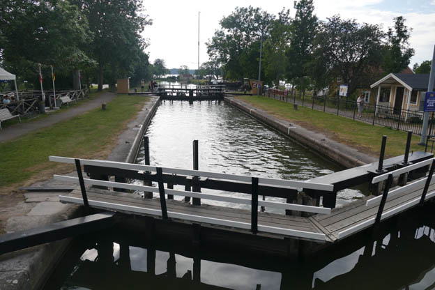 Vi fick inte se när någon båt passerade slussen, däremot såg vi flera båtar som låg förtöjda innanför den.