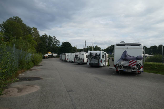 När vi kom fanns det bara en annan husbil där, och ett tält. Senare på kvällen kom det några flera, men det fanns väldigt många platser kvar. Jag fick hjälpa några tyskar att betala. De kunde inte betala med swish, eftersom man måste ha en svensk bank då. De hade växlat till sig svenska pengar innan de åkte hemifrån, men det minsta de hade var 200 eller 500 kr. Ryktet spred sig att jag gärna tog emot Euro, så vi swishade åt ett par stycken i utbyte mot 6 Euro, som växlingskursen var då. Jag sa åt dem att gå och köpa en liter mjölk någonstans vid tillfälle, för att spräcka deras stora sedlar. Eller fisk i rökeriet i centrum.