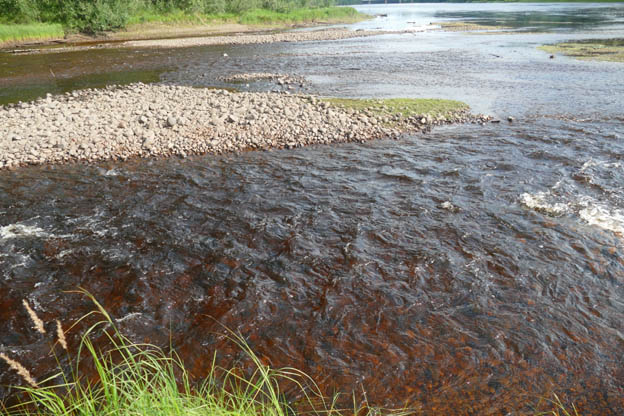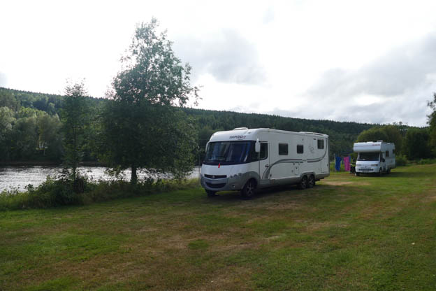 Lagom när receptionen skulle öppna kom solen. Nästan i alla fall. I receptionen var en trevlig kvinna. Vi bokade in oss på två dygn här, av flera olika skäl. Vädret skulle bli bättre dagen därpå, och då ville vi fiska. Vi hade inte gjort det ännu på den här semestern. Campingen verkade vara trevlig och utsikten över älven var fin, och det är ett bra skäl. Efter ett par veckor på resande fot ville vi passa på att tvätta. Dessutom hade vi kört mycket, och ville ha en dag fri från bilkörning.