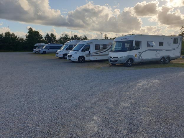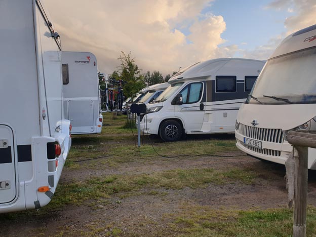 Det blir lite trångt mellan bilarna på kvällen. Vi kom fram kl 17.30 och det fanns många platser kvar. Kl 21 fanns det fortfarande några platser kvar längs med kanterna. Det här är precis som jag tycker att en ställplats ska vara. Det finns den nödvändigaste servicen, det finns några elstolpar (först till kvarn) och man stannar för att övernatta på ett övervakat ställe. En ställplats alltså. Vill man ha pool, dusch och grejer finns det ju campingar. Vi har dusch och toa i bilen.