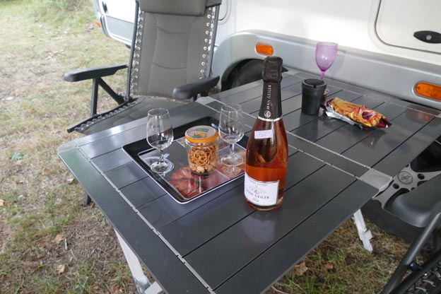 Vi gick till receptionen, där de sålde lokalt vin. Vi köpte en flaska, och pratade lite med campingvärden. När han fick höra att vi skulle se på Sverige i fotbolls-VM på kvällen skickade han med oss vin, varsitt glas och en burk snacks till bilen. Vi fick låna en bricka att bära på, och lovade att lämna tillbaka glas och bricka dagen därpå. Sådant händer aldrig i Sverige.
