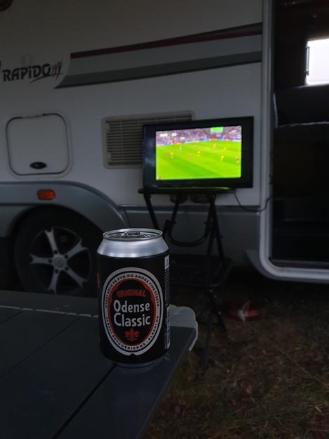 När vi hade burit hem vin, glas och allt, och fått igång streamingen på Tv:n, var det bara att vänta på fotboll. Sladden till Tv:n räckte precis ut så att vi kunde spänna fast den på en pall ute. Perfekt.