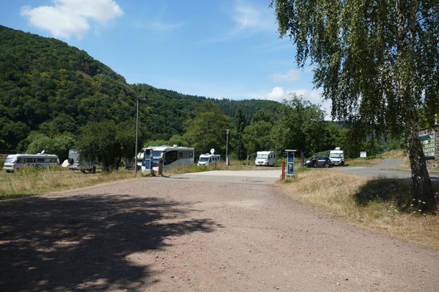 Ställplatsen i Enkirch är stor. Det finns inga markerade platser, man väljer själv hur man står. Det finns en stor gräsplan längs med floden, där det finns elstolpar. Vi valde en skuggplats under träden, för värmen var tillbaka igen. Bland träden finns ingen el.