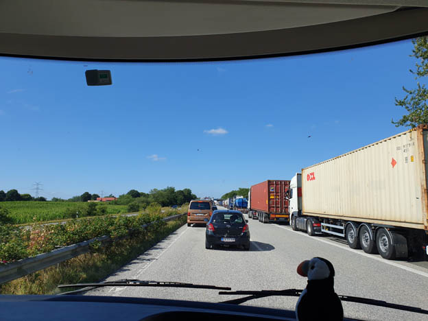 Innan gränsen till Danmark var det också långa köer. Vi satt snällt och väntade på vår tur, och körde in bland långtradarna så fort det gick.