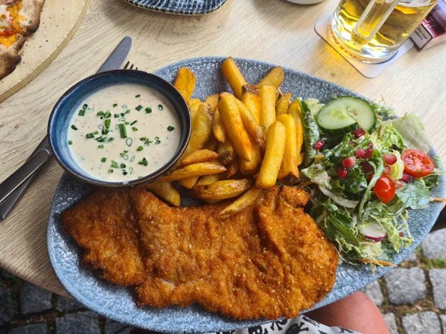 Vi åt väldigt bra mat på Bar-be-kube. Jag valde schnitzel och Lelle pizza.