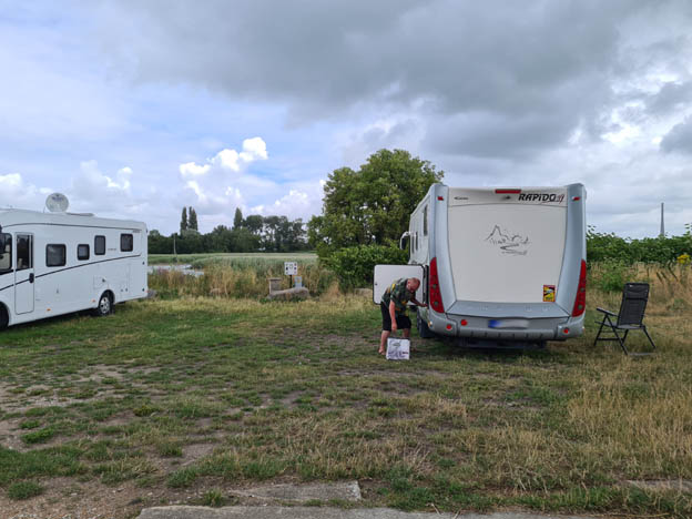 Vi kom fram till ställplatsen i Honfleur redan före kl 12.00. Det var massor av bilar där. Vi hade en väldig tur och fick en av platserna på gräs. Det finns 7-8 gräsplatser, resten är på grus. Gräsplatserna är omarkerade. Grusplatserna är markerade med stockar i marken. Man står väldigt tätt, det är som en vanlig parkering. Jag tror att vi fick den bästa platsen. Eftersom vi stod längst in på gräset kunde vi fälla ut vår markis och sitta ute fastän det regnade. När vi stod inne i bilen såg vi lite av Seines delta.