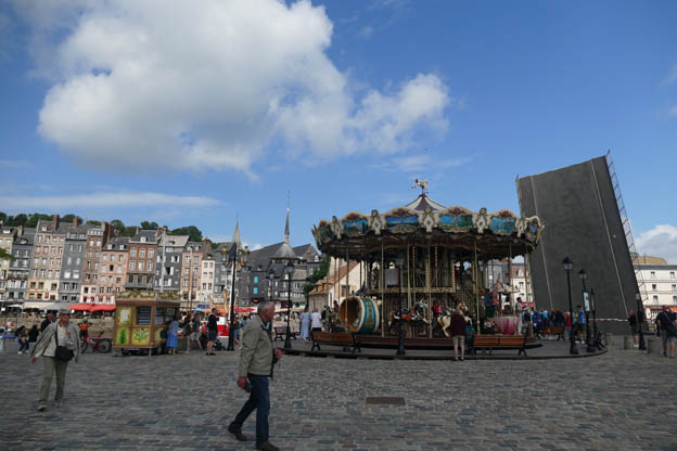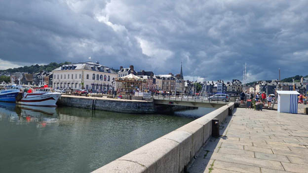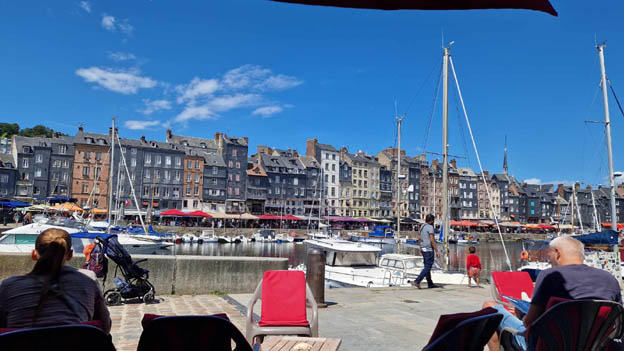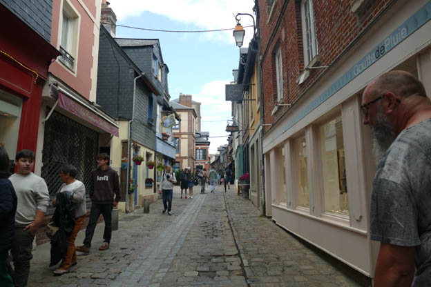 Vi tog en sovmorgon, sedan gick vi in till Honfleur. Det tar ca 10 minuter att gå från ställplatsen. Honfleur är en mysig gammal stad. Det finns torg, små trånga gränder, små butiker och många uteserveringar. Det finns många vackra gamla hus. Den äldre delen av Honfleur är väldigt turistig. Vädret var omväxlande; strålande sol och störtskurar. Som tur är finns det många uteserveringar med tak där man kan söka skydd från regnet.