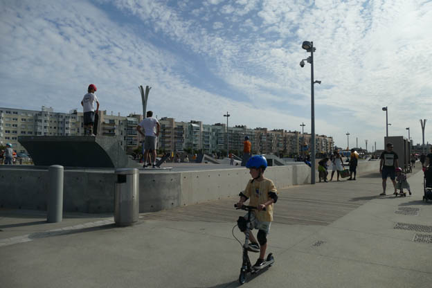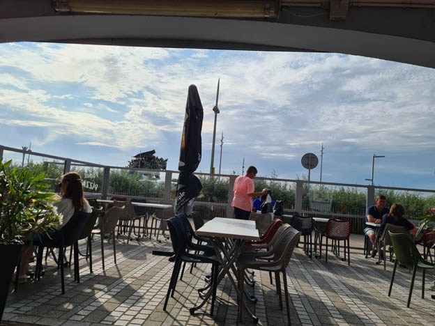 Vi cyklade in till strandpromenaden, drygt en kilometer från ställplatsen. Där hade de också gjort om massor sedan vi var där sist. Det var mycket mer turistigt, och det fanns redskap för olika aktiviteter längs hela stranden. Vi satt på en uteservering och tittade på hela spektaklet. Klockan 19.00 började restaurangerna öppna sina kök, så vi beställde kanonbra pizza.