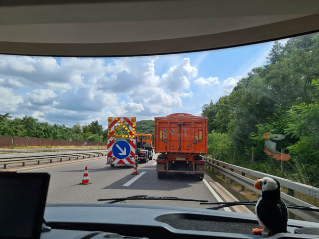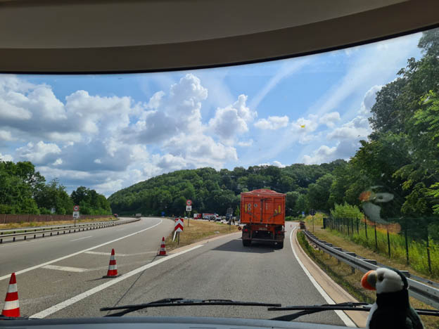 När vi kom in i Tyskland var det en rejäl poliskontroll. De vinkade in alla fordon på en stor rastplats. Många husbilar och husvagnar blev vägda, och det stod flera där som hade haft överlast. De fick slänga grejer i en stor container. Oss vinkade polisen bara förbi. Vi har tillräckligt mycket lastvikt, och det kanske de kunde se på bilen.
