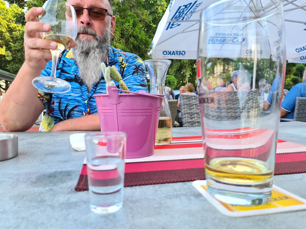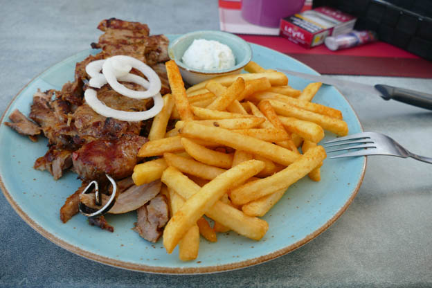 Det finns en pizzeria precis bredvid parkeringen. Vi kollade vad mer som fanns i Google Maps och hittade en grekisk restaurang, Restaurant Neckarau, 450 meter bort längs floden. Det fanns en bra gångväg dit. De hade helt otroligt bra mat och service. Det var nog den bästa gyros jag har ätit. Efter maten bjöds vi på varsitt glas ouzo. När vi skulle betala fungerade inte våra kort, så vi fick göra slut på våra sista kontanter. Restaurangägaren var snäll och visade på google maps vart det fanns en bankomat så vi kunde ta ut mer pengar. För säkerhets skull ritade han en karta på en servett också. Mycket trevlig man.